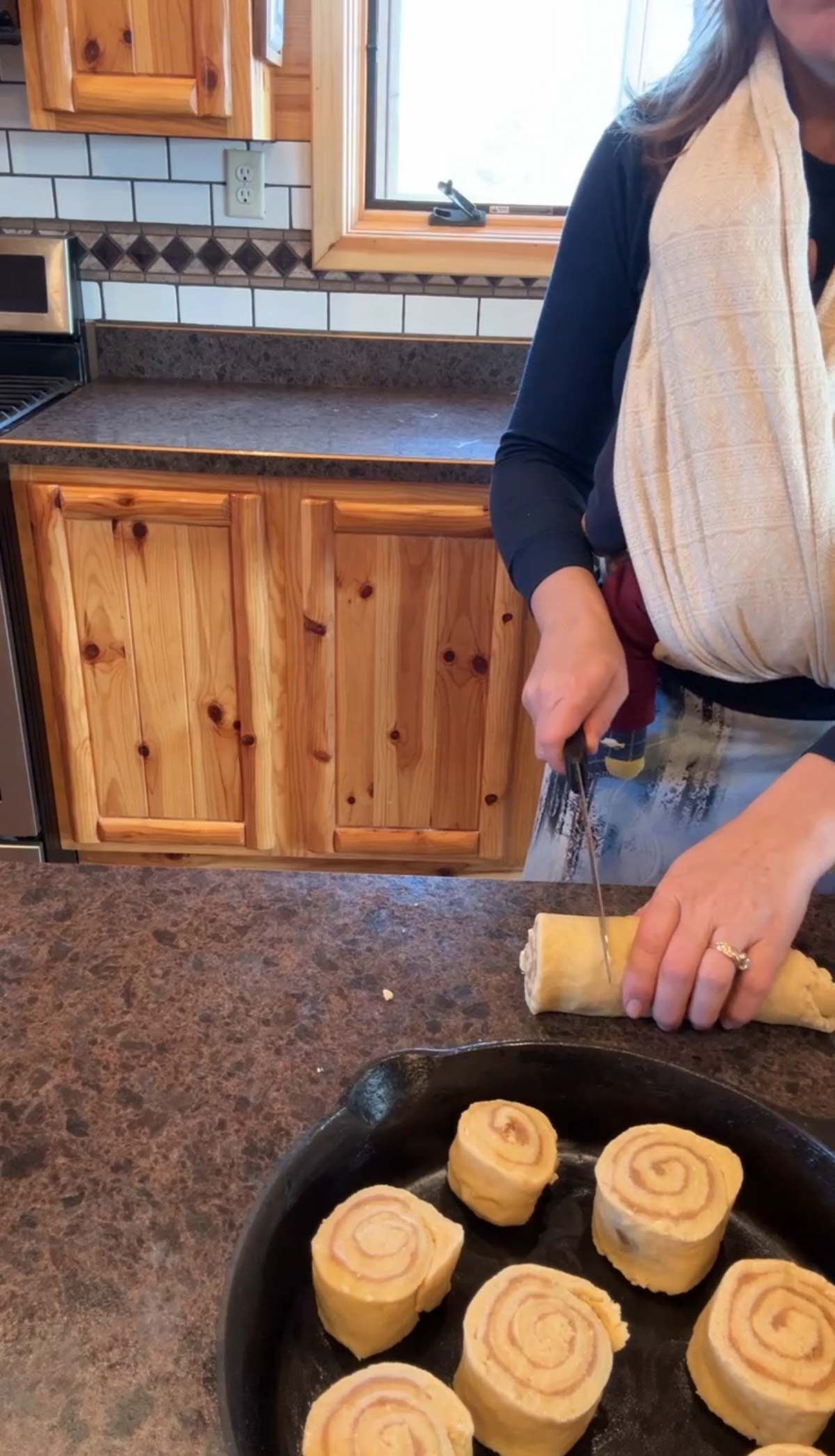 - Using a sharp serrated knife, cut rolls into 12 equal pieces.